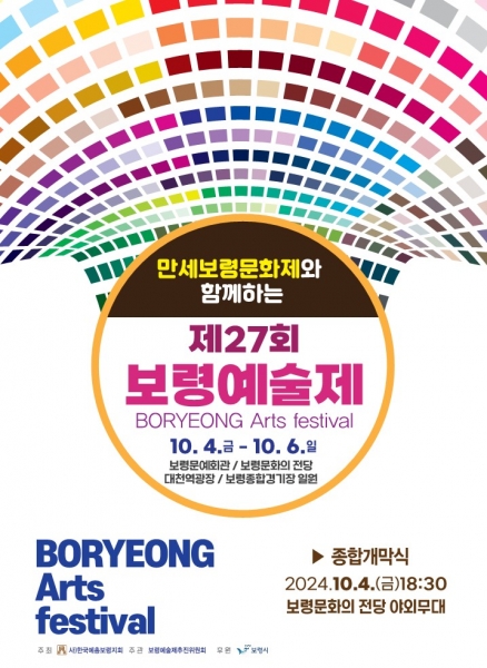 보령예술제는 ‘보령 예술로 꽃피우다’를 슬로건으로 오늘 10월 4일부터 6일까지 3일간 보령문화의전당, 보령문화예술회관, 대천역 광장, 보령종합경기장 일원에서 개최한다.