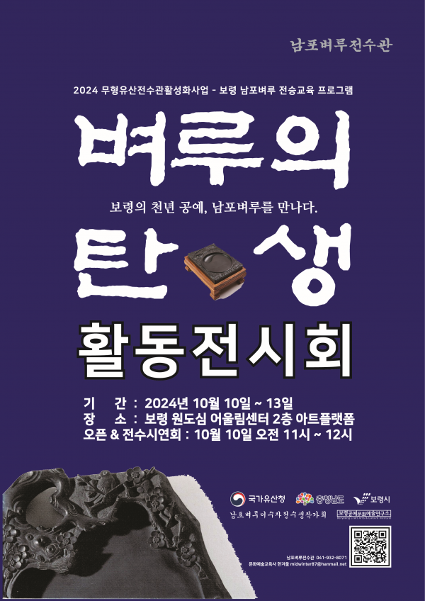 이번 행사는 국가유산청·충청남도·보령시가 주관하고 남포벼루이수자전수생작가회가 주최하며 ‘2024 무형유산 전수교육관 활성화 사업’의 일환으로 진행된 보령 남포벼루 전승교육 프로그램 ‘벼루의 탄생’의 작품을 전시하기 위해 마련됐다.
