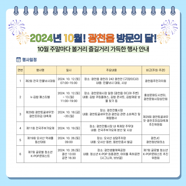 광천읍은 10월 한 달간 제2회 전국 민물낚시대회를 시작으로 K-김밥 페스티벌, 제29회 광천토굴새우젓·광천조미김 대축제, 제11회 전국주부가요제, 제19회 오서산 억새풀 등산대회, 제7회 글로벌 청소년 K-POP콘테스트 등 6개의 대표 행사를 개최한다.