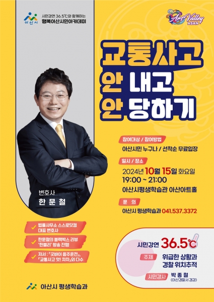 [충청뉴스큐] 아산시가 오는 15일 저녁 7시 평생학습관 아산아트홀에서 한문철 변호사를 초청해 ‘행복아산 시민아카데미’를 연다.