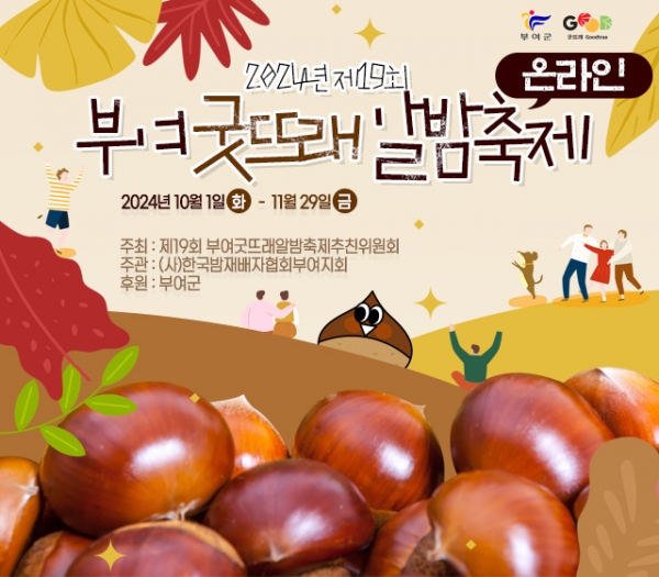 [충청뉴스큐] 부여군은 전국 최대 밤 생산지로서 2024년 제19회 부여 굿뜨래 알밤축제를 11월 29일까지 온라인으로 개최한다.