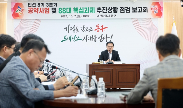 [충청뉴스큐] 대전 동구는 7일 구청 대회의실에서 2024년 3분기 ‘민선 8기 공약사업 및 88대 핵심과제 추진 상황 보고회’를 개최했다.