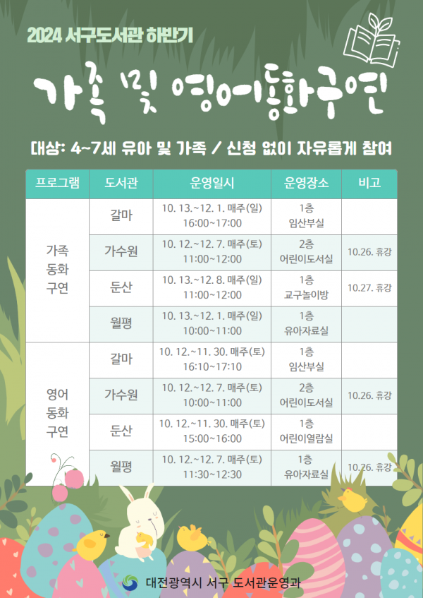 [충청뉴스큐] 대전 서구 4개 공공도서관은 주말 시간 온 가족이 함께 즐길 수 있는 하반기 가족동화구연 및 영어동화구연을 운영한다.