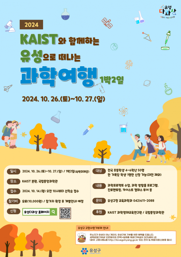 [충청뉴스큐] 대전 유성구는 10월 26일부터 KAIST와 함께하는 가족친화형 1박 2일 과학체험 프로그램인 ‘유성으로 떠나는 과학여행’을 개최한다.