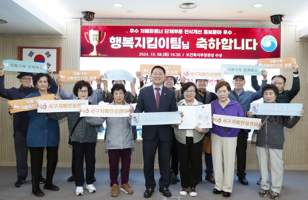 [충청뉴스큐] 대전 서구는 보건복지부 주최로 진행된 ‘2024 우수 치매파트너 활동 경진대회’에서 서구치매안심센터 소속 행복지킴이팀이 우수상을 받는 쾌거를 이뤘다고 10일 밝혔다.