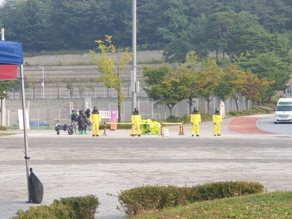 [충청뉴스큐] 아산시보건소는 지난 8일 이순신종합운동장에서 충남도청 주관, 아산시보건소 주최로 ‘2024년 생물테러 대응 대규모 훈련’을 실시했다.