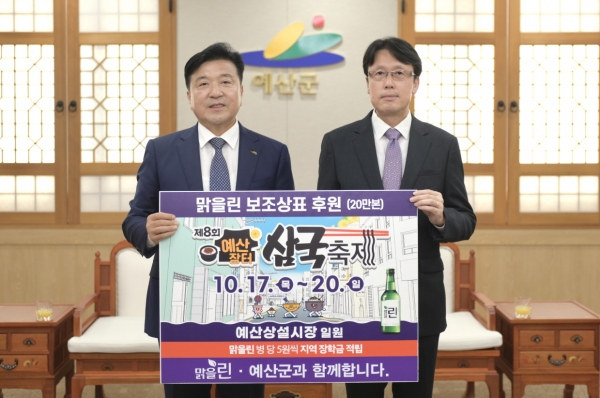 [충청뉴스큐] 예산군과 ㈜선양소주는 군청 상황실에서 최재구 예산군수와 강재규 ㈜선양소주 영업본부장 등이 참석한 가운데 군 대표 축제인 ‘제8회 예산장터 삼국축제’의 홍보를 위한 ‘맑을 린’ 소주 홍보라벨 전달식을 진행했다고 11일 밝혔다.