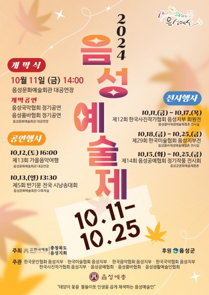 한편 이달 11일부터 25일까지 2주 동안 열리는 음성예술제는 개막식 공연인 ‘음성국악협회, 음성품바협회 정기공연’을 시작으로 △12일에는 ‘제13회 가을음악여행’ △13일에는 ‘제5회 반기문 전국 시낭송대회’ 가 음성문화예술회관에서 진행된다.