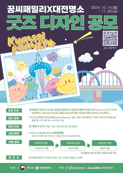 이번 공모전은 10월 14일부터 11월 29일까지 대전의 대표 캐릭터인 ‘꿈씨패밀리’ 와 ‘대전의 주요 명소’ 등을 활용한 창의적이고 상품성 있는 중저가형 굿즈 디자인 개발을 위해 진행된다.