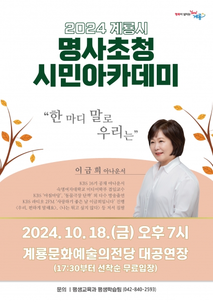 [충청뉴스큐] 계룡시는 오는 18일 오후 7시 계룡문화예술의전당 대공연장에서 2024년 세번째 계룡시 명사초청 시민아카데미를 개최한다고 밝혔다.