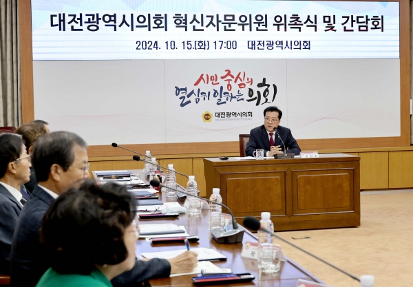 [충청뉴스큐] 대전시의회는 15일 시의회 소통실에서 대전광역시의회 혁신자문위원 위촉식 및 간담회를 갖고 대전시의회의 역사 이래 최초로 의장 직속 ‘대전광역시의회 혁신자문위원회’의 공식 출범을 알렸다.