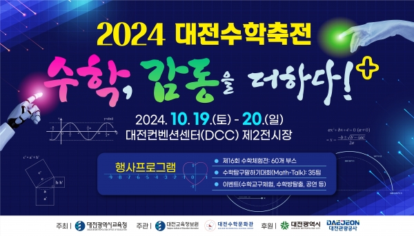 [충청뉴스큐] 대전교육정보원 부설 대전수학문화관에서는 오는 10월 19일부터 20일까지 대전컨벤션센터 제2전시장에서 ‘2024 대전수학축전’을 개최한다고 밝혔다.