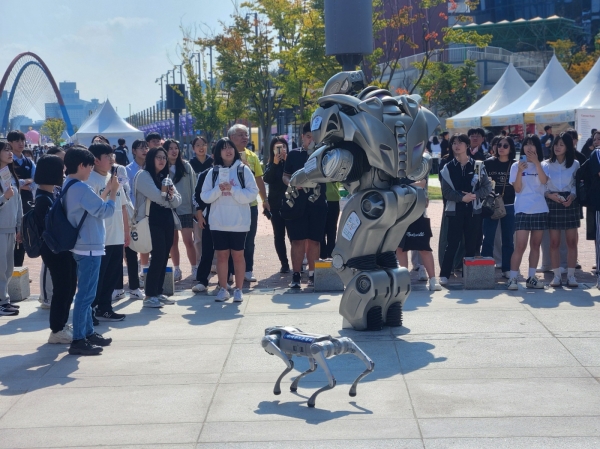 [충청뉴스큐] 지난 11일 대전 유성구 엑스포공원 한빛탑 일원에서 열린 중부권 최대 진로박람회인 ‘유성구 청소년 나Be한마당’에 방문한 청소년들이 대형 로봇 타이탄과 로봇개를 보며 즐거운 시간을 보내고 있다.