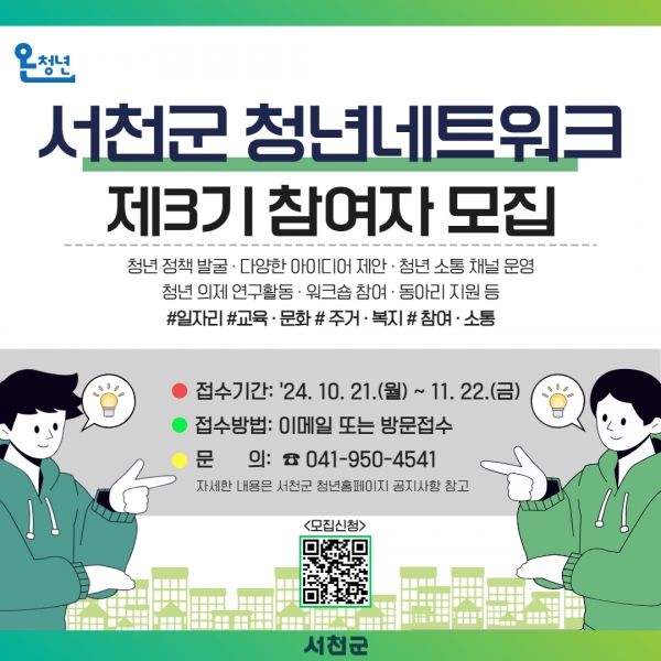 [충청뉴스큐] 서천군은 오는 21일부터 다음달 22일까지 ‘제3기 서천군 청년네트워크’ 위원을 모집한다.