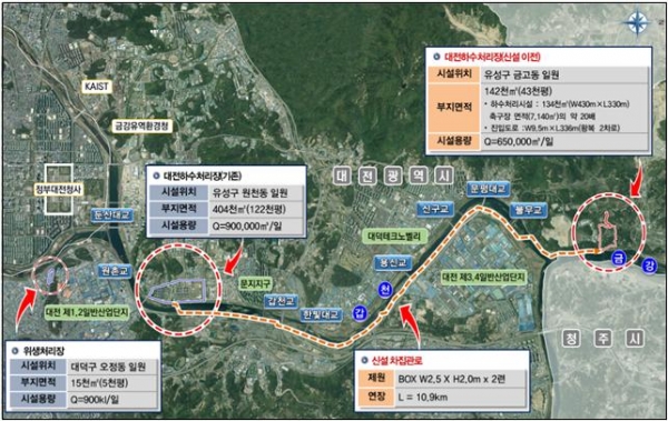 대전하수처리장 시설현대화 민간투자사업으로 총사업비 7,176억원을 투입해 유성구 원촌동 일대 하수처리장과 대덕구 오정동 분뇨처리장을 유성구 금고동 103번지 일원 14만㎡의 부지로 통합·이전 중이다.