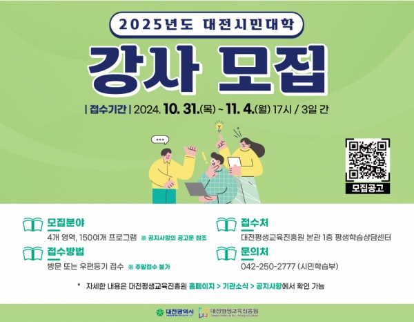 [충청뉴스큐] 대전평생교육진흥원은 2025년에 활동할 대전시민대학 강사 150여명을 10월 31일부터 11월 4일 오후 5시까지 모집한다.