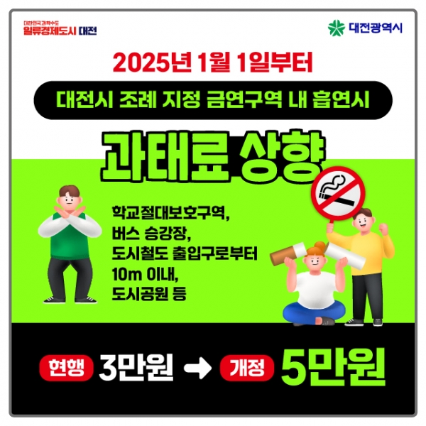 [충청뉴스큐] 대전시는 ‘금연구역 지정 등 흡연피해 방지 조례’일부 개정에 따라 조례에서 지정한 금연구역에서 흡연 시 부과하는 과태료를 2025년 1월 1일부터 기존 3만원에서 5만원으로 상향 적용한다.