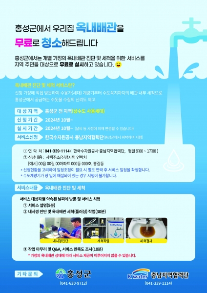 이에 군에서는 ‘홍성군 옥내급수설비 세척지원 조례’를 제정하고 올해 2,000만원의 예산을 투입해 사업 규모를 확대했다.