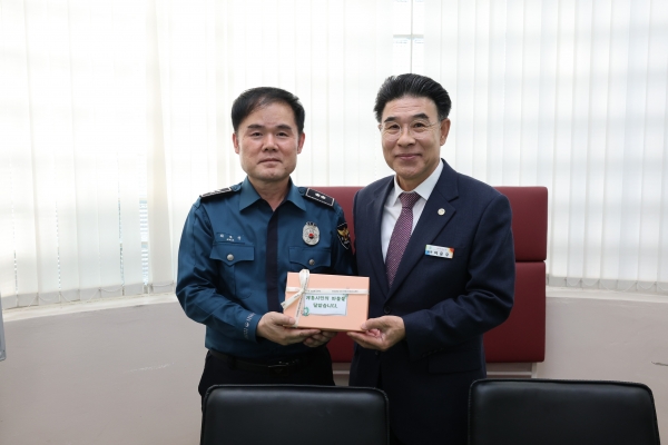 이 시장은 경찰의 날을 기념해 제작한 레터링 케이크와 격려품 그리고 지난 19일 열린 소통마켓 행사에서 시민들이 직접 작성한 마음을 담은 감사엽서를 시민소통위원과 함께 전달했다.
