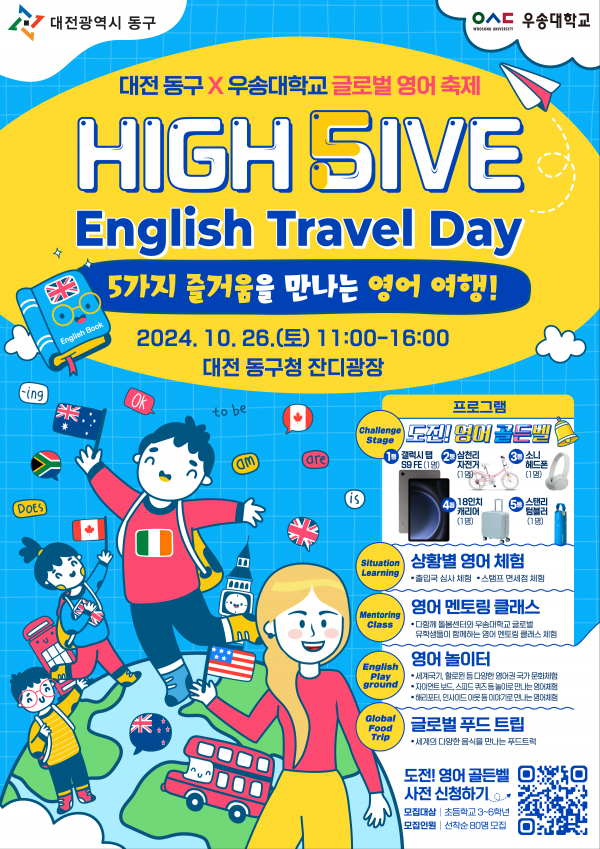 이번 축제는 “High 5ive English Travel Day”를 주제로 △‘인사이드 아웃’ 캐릭터 만들기 △‘해리포터’ 기숙사 테스트 △‘할로윈’ 액세사리 만들기 △‘디즈니’ 캐릭터 키링 체험 △세계음식 푸드트럭 운영 등 11개의 다양하고 흥미로운 체험 부스와 풍성한 볼거리로 채워질 예정이다.