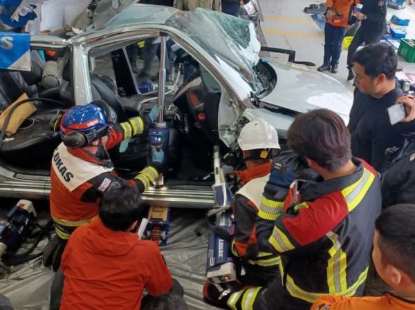 이번 훈련은 배터리형 유압장비 도입에 앞서 실제 차량을 활용해 유압장비 조작 및 활용법 등을 익히고 차량에 갇힌 인명에 대한 구조 능력을 높이기 위해 마련됐다.