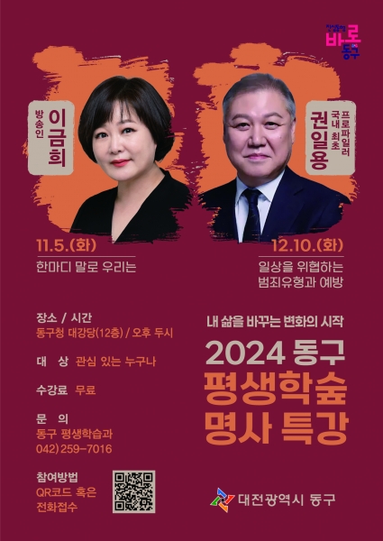 [충청뉴스큐] 대전 동구는 평생학습 활성화를 위해 준비한 하반기 ‘평생학숲 명사 특강’ 이 분야별 저명인사 초청으로 시작 전부터 주민들의 뜨거운 관심을 받고있다고 23일 밝혔다.