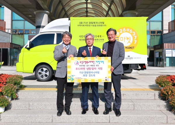 [충청뉴스큐] 대전 유성구는 24일 ㈜기산·경림엔지니어링 강도묵 회장의 나눔으로 대전행복나눔무지개푸드마켓 6호점에 1톤 냉동탑차를 전달했다고 밝혔다.