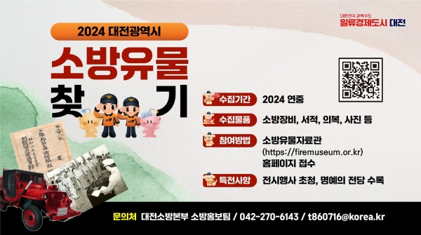 대전시 소방본부 관계자는“소방의 역사 유물을 수집해 미래세대를 위한 소중한 교육자료로 활용할 것”이라며“소방 유물 찾기 운동에 시민들의 많은 관심과 협조를 당부드린다”고 말했다.
