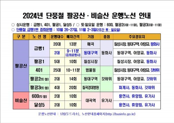 [충청뉴스큐] 팔공산 첫 단풍이 10월 18일에 시작해 10월 29일에 절정일 것으로 관측되는 등 팔공산 순환도로 방문객이 크게 증가할 것으로 예상되므로 차내 혼잡도 완화를 위해 10월 마지막 주, 11월 첫째 주 토·일요일에 동화사 방면의 주요 노선인 급행1번 노선을 기존 20대에서 22대로 2대 증회운행한다.