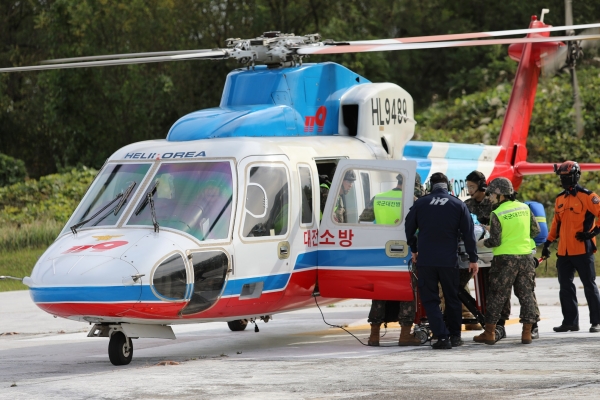 국군대전병원 환자와 군 의료진을 대전 소방헬기를 이용해 국군수도병원으로 이송하는 훈련으로 헬기 내 응급활동 사항 등을 점검했다.