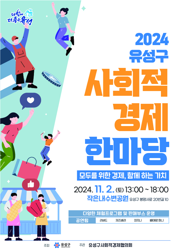 [충청뉴스큐] 대전 유성구는 11월 2일 오후 1시부터 6시까지 봉명동 작은내수변공원에서 ‘2024 유성구 사회적경제 한마당’ 행사를 개최한다고 밝혔다.