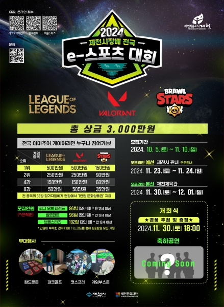 한편 2024 제천시장배 e-스포츠대회는 오는 11월 23일부터 양일간 제천에서 오프라인 예산을 거쳐 11월 30일부터 12월 1일까지 제천체육관에서 본선이 개최된다.