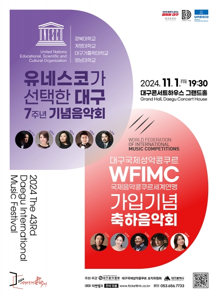 [충청뉴스큐] 대구광역시는 대구국제성악콩쿠르의 국제음악콩쿠르 세계연맹 가입을 축하하고 유네스코 음악창의도시 대구 지정 7주년을 기념하는 음악회를 11월 1일 오후 7시 30분 대구콘서트하우스 그랜드홀에서 개최한다.