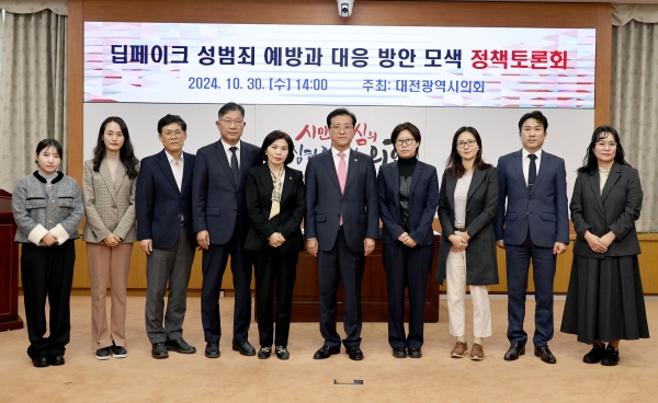 [충청뉴스큐] 대전시의회는 30일 시의회 소통실에서 조원휘 의장주재로 ‘딥페이크 성범죄 예방과 대응 방안 모색 정책토론회'를 개최했다.
