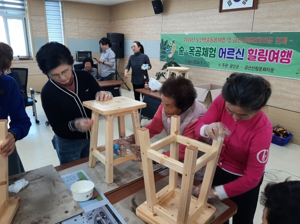 어르신 힐링여행은 지난 5월부터 10월까지 노인맞춤돌봄 어르신을 대상으로 추진됐으며 무장애나눔길을 따라 걷는 숲산책과 목공지도사와 함께하는 의자, 찻상 등 생활가구 만들기를 진행했다.