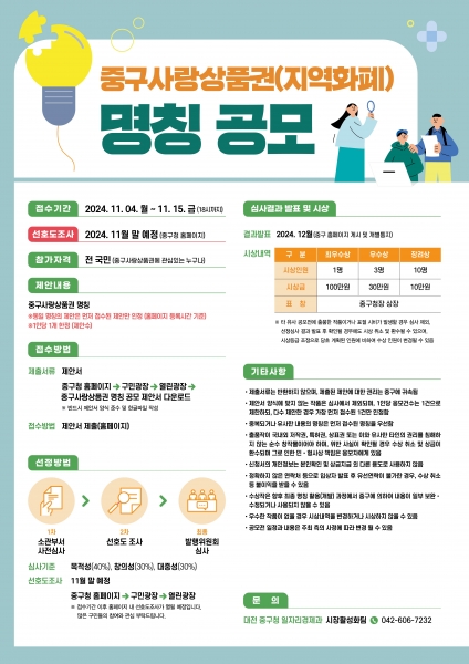 김제선 중구청장은 “이번 명칭 공모전은 단순히 이름을 짓는 것이 아니라, 중구사랑상품권에 대한 주민들의 관심과 공감을 이끌어내고 지역화폐가 가진 의미를 더 깊이 이해하는 기회가 될 것”이라며 “중구사랑상품권이 우리 지역 경제를 활성화하고 주민들께 실질적인 혜택을 드릴 수 있도록 지속적으로 노력하겠다”고 전했다.