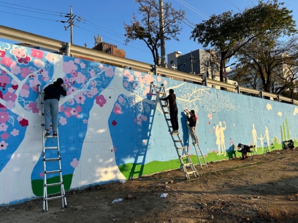 이번 사업은 지난 9월부터 시작되어 갑천변을 이용하는 주민들에게 쾌적한 환경을 제공하고 깨끗한 마을 경관을 만들기 위해 높이 4M, 길이 75M의 노후 벽화를 교체했다.