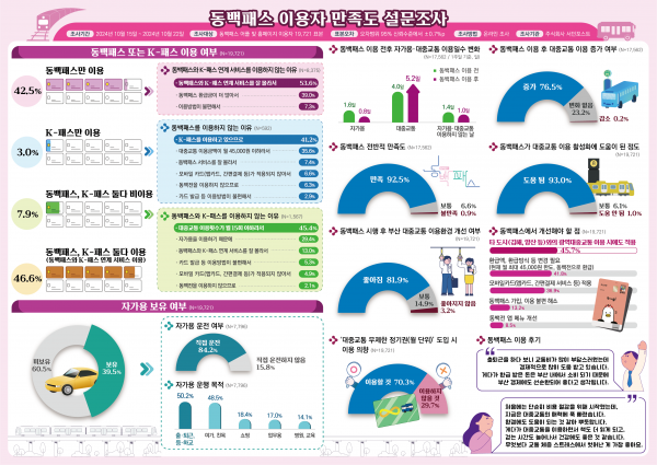 박형준 시장은 “이번 설문조사를 통해 '동백패스'가 시민들의 교통비 부담을 덜어주고 대중교통 이용을 활성화하는 데 큰 역할을 하는 것으로 나타났으며 지난해 대중교통 수송분담률 또한 44.4퍼센트로 준공영제 시행 이후 역대 최고를 기록했다”며 “앞으로도 '동백패스'를 지속적으로 개선해 시민들이 더 편리하게 이용할 수 있도록 시민의 목소리에 귀 기울이고 대중교통이 가장 편리한 도시 부산이 되도록 노력하겠다”고 밝혔다.