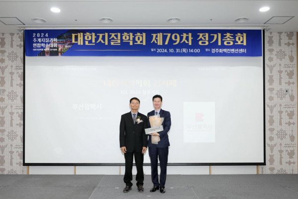 [충청뉴스큐] 부산시는 지난 오후 2시 경주 화백컨벤션센터에서 열린 제79차 대한지질학회 정기총회에서 ‘2024 부산 세계지질과학총회’ 성공 개최의 공로를 인정받아 감사패를 수상했다고 밝혔다.