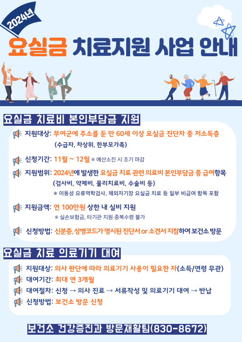 [충청뉴스큐] 부여군은 올 연말까지 부여군에 주소를 둔 만 60세 이상 저소득층 부여군민을 대상으로 요실금 치료에 따른 의료비 본인부담금을 연 100만원 범위에서 지원한다.