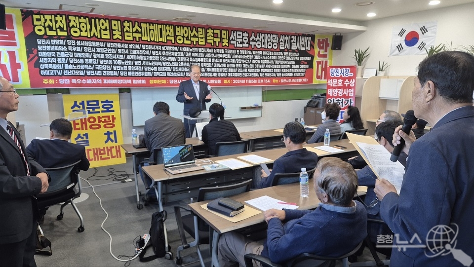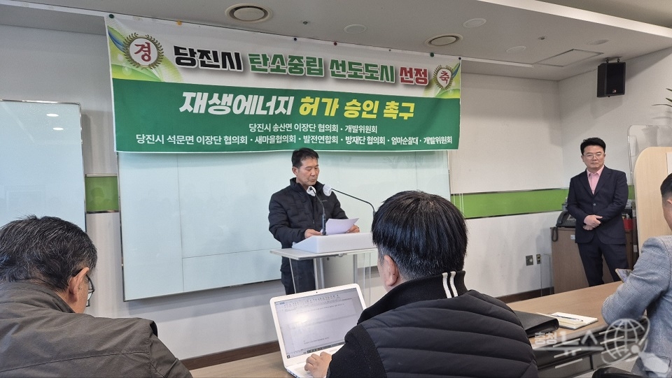 충남 당진 석문호수상태양광발전 사업과 지난 5일 당진시청 브리핑룸에서 찬반 양측 지지자와 주민들이 기자회견을 열고 각각 입장을 표명했다.