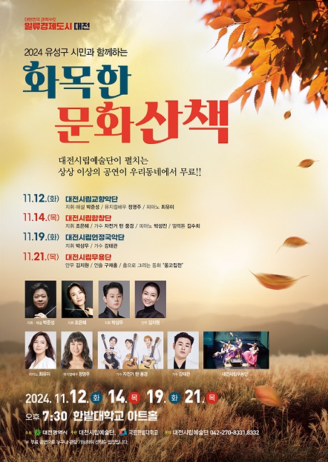 [충청뉴스큐] 대전시립예술단은 이달 12일부터 2주간에 걸쳐 화요일과 목요일 오후 7시 30분에 유성구 한밭대학교 아트홀에서 시민을 위한 ‘화목한 문화 산책’ 공연을 연다.