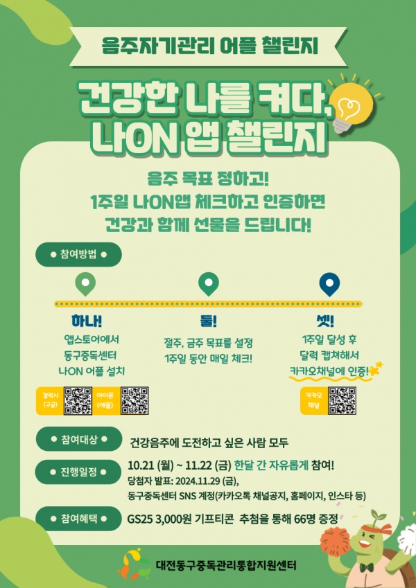 이번에 진행되는 ‘나ON’앱 챌린지는 동구 주민을 비롯해 누구나 참여가 가능하며 앱 설치 후 절주·금주 목표를 설정해 일주일간 목표 달성한 달력을 캡처해 대전 동구 중독관리 통합지원센터 카카오채널에 인증하면 추첨을 통해 경품이 지급된다.