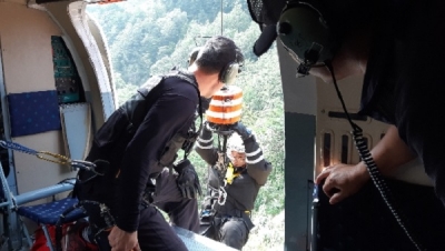 이는 가을철 산악사고 발생시 헬기로 신속히 출동하여 환자를 구조하는 훈련으로 대형헬기에 장착된 호이스트를 이용해 구조사 하강 후 환자처치 및 구조용 들것으로 안전하게 구조하는 훈련이다.
