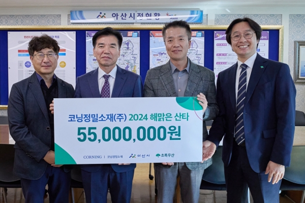[충청뉴스큐] 지역사회의 삶의 질 개선을 위한 사회공헌 활동에 앞장서고 있는 코닝정밀소재가 지난 7일 초록우산과 함께 아산시청을 방문해 ‘2024 해맑은 산타’ 사업 후원금으로 총 5천5백만원을 전달했다.