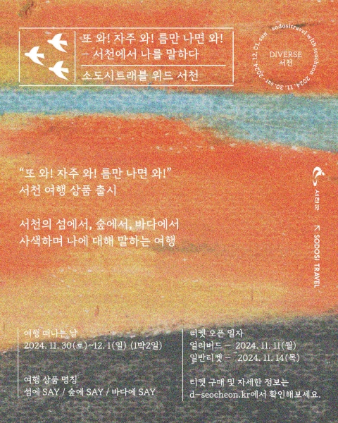 주요 프로그램은 △유부도 철새탐조와 서천갯벌 체험‘섬에 say’, △전문 매거진 에디터와 함께 서천 레트로 명소 탐방 및 나만의 여행 매거진 만들기 ‘숲에 say’, △서해랑길 56코스 걷고 맛집 체험하는 ‘바다에 say’등이다.