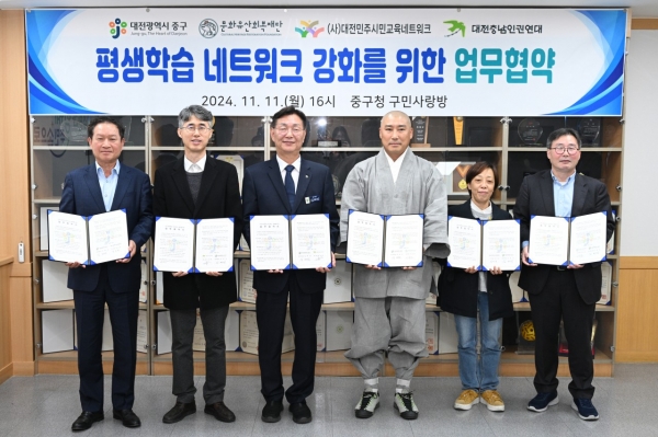 [충청뉴스큐] 대전 중구는 지난 11일 지역 평생학습 운영 및 활성화에 필요한 네트워크 강화를 위해 문화유산회복재단, 대전민주시민교육네트워크, 대전충남인권연대와 업무협약을 체결했다고 밝혔다.