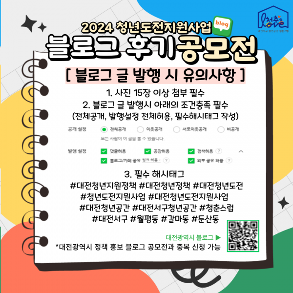 [충청뉴스큐] 대전 서구 청년활동공간 청춘스럽은 청년도전지원사업에 대한 관심을 높이고 사업성과를 공유·확산하기 위해 2024년 11월 1일부터 11월 29일까지 청년도전지원사업 블로그 후기 공모전을 개최한다.