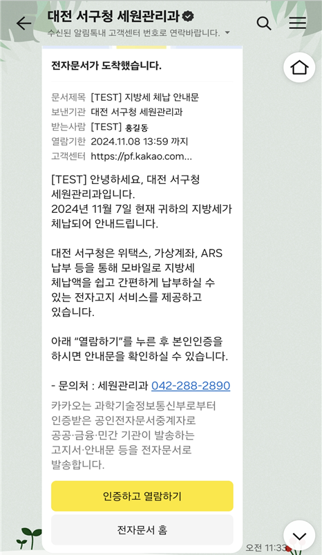 [충청뉴스큐] 대전 서구가 오는 18일부터 4일간 지방세 체납고지서 및 납부 안내문을 카카오톡을 통해 모바일 전자문서로 발송한다.