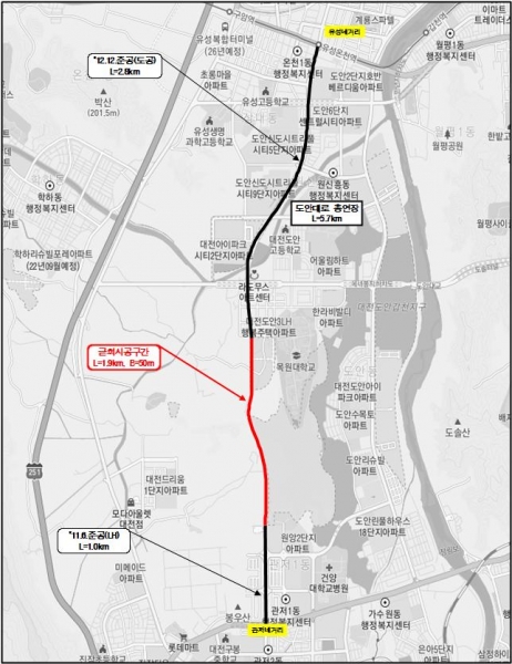 한편 서남부지역 남북 연결로 주변 지역의 중추적인 교통기능 담당을 위해 시작된 도안대로 건설은 서구 관저네거리부터 유성구 유성네거리까지 총연장 5.7km를 3구간으로 나눠 추진됐다.